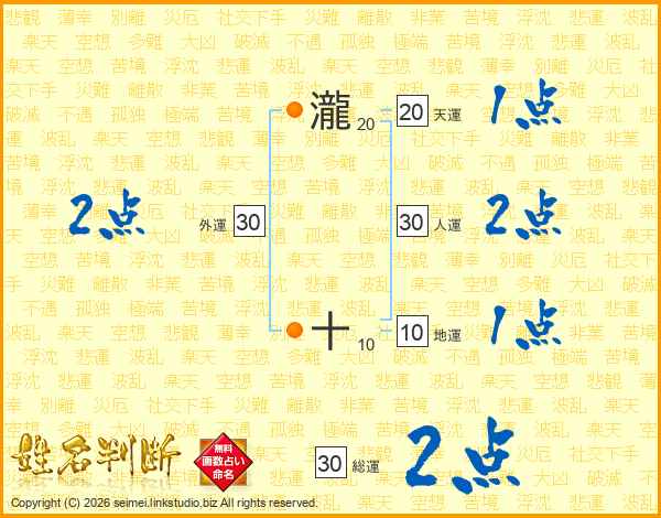 生活面を象徴する運勢です。外部から受ける影響力を表し、結婚運、家庭運や職場、環境への順応性を表します。総運から人運を引いた画数。姓や名が1文字の場合を除く。