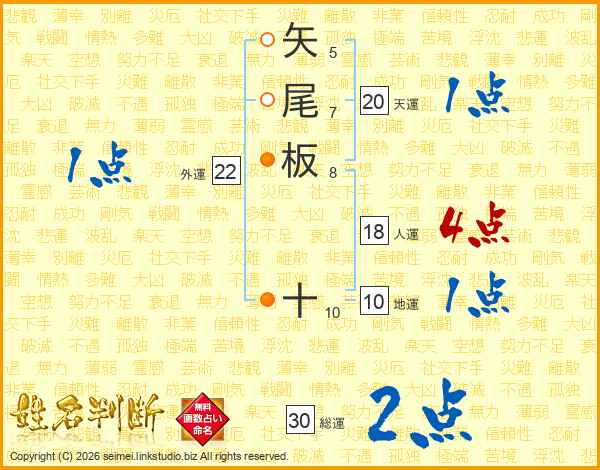 生活面を象徴する運勢です。外部から受ける影響力を表し、結婚運、家庭運や職場、環境への順応性を表します。総運から人運を引いた画数。姓や名が1文字の場合を除く。