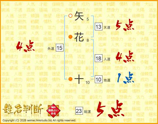 矢花十さんの総運は23画の5点!