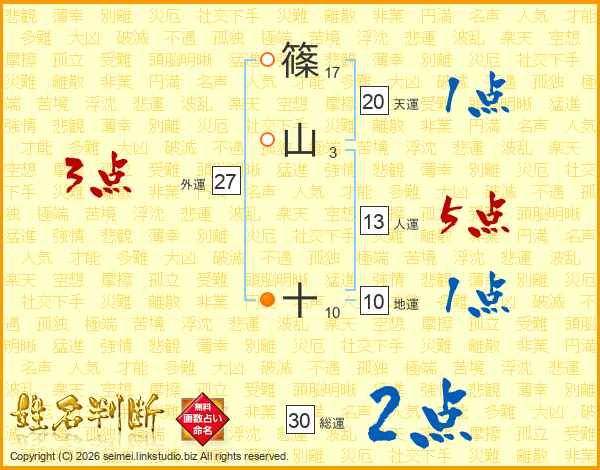 生活面を象徴する運勢です。外部から受ける影響力を表し、結婚運、家庭運や職場、環境への順応性を表します。総運から人運を引いた画数。姓や名が1文字の場合を除く。