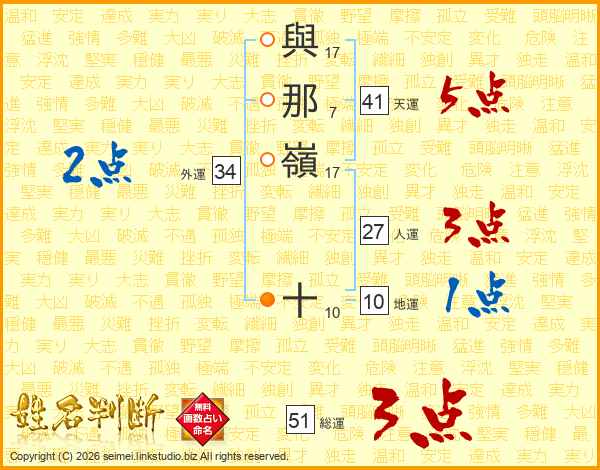 生活面を象徴する運勢です。外部から受ける影響力を表し、結婚運、家庭運や職場、環境への順応性を表します。総運から人運を引いた画数。姓や名が1文字の場合を除く。
