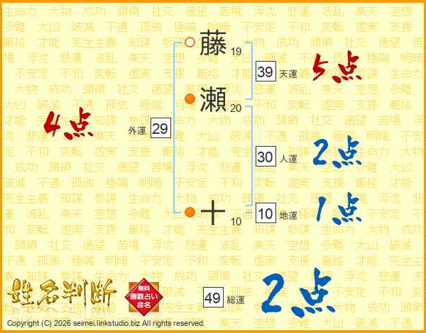 家系が持つ宿命的な運勢を表します。祖先から受け継いだ苗字ですので自分の力が及びません。家柄を象徴します。苗字の合計画数。
