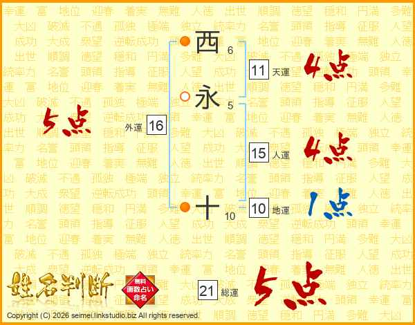 生活面を象徴する運勢です。外部から受ける影響力を表し、結婚運、家庭運や職場、環境への順応性を表します。総運から人運を引いた画数。姓や名が1文字の場合を除く。