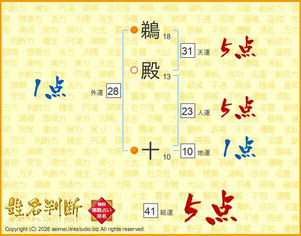 あなたの人生を表す1番重要な運勢です。生涯を通じて影響する総合運となり、主に50歳以降の晩年期に影響を及ぼします。苗字と名前の合計画数。