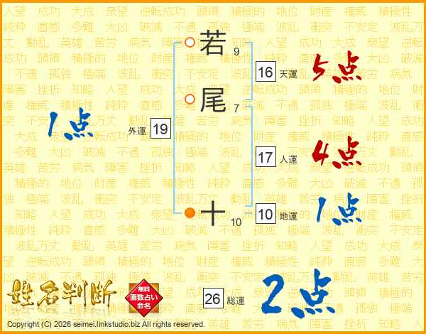 生活面を象徴する運勢です。外部から受ける影響力を表し、結婚運、家庭運や職場、環境への順応性を表します。総運から人運を引いた画数。姓や名が1文字の場合を除く。
