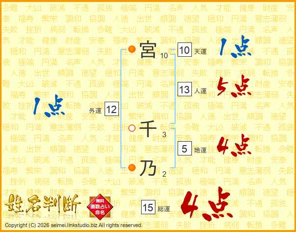宮千乃さんの総運は15画の4点!
