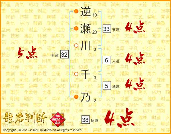 逆(10画)瀬(20画)川(3画) 千(3画)乃(2画)
