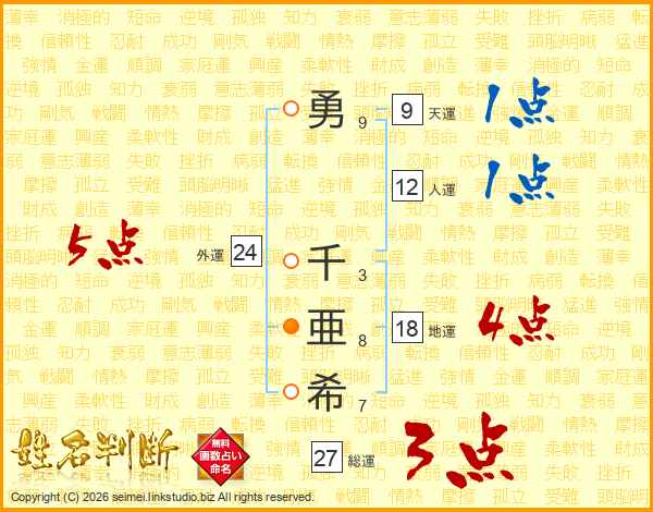 画数の奇数(○陽)と偶数(●陰)の配列で吉凶を占います。どちらかにかたよる名前は大凶名で避ける必要があります。画数の奇数偶数。
