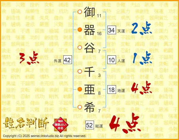 御器谷千亜希さんの総運は52画の4点!