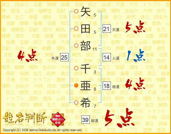 矢田部千亜希さんの総運は39画の5点!