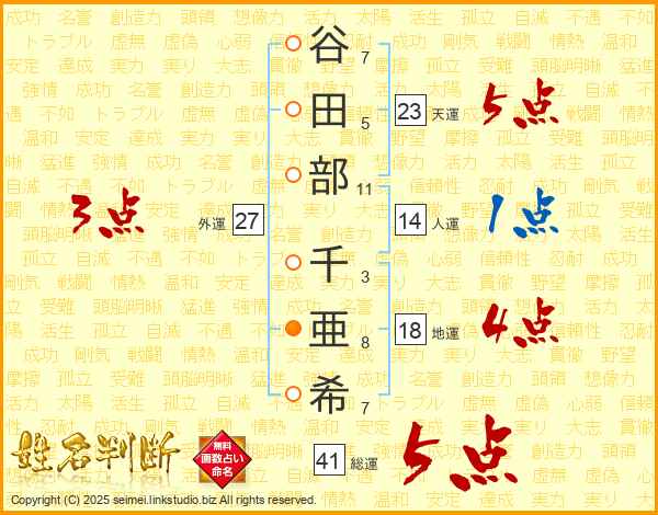 谷(7画)田(5画)部(11画) 千(3画)亜(8画)希(7画)