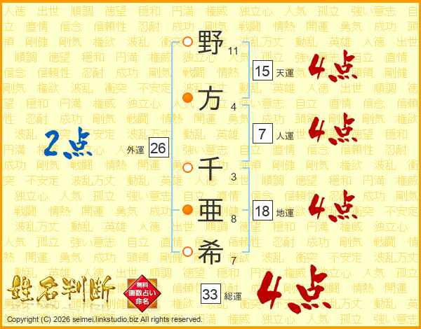 野(11画)方(4画) 千(3画)亜(8画)希(7画)