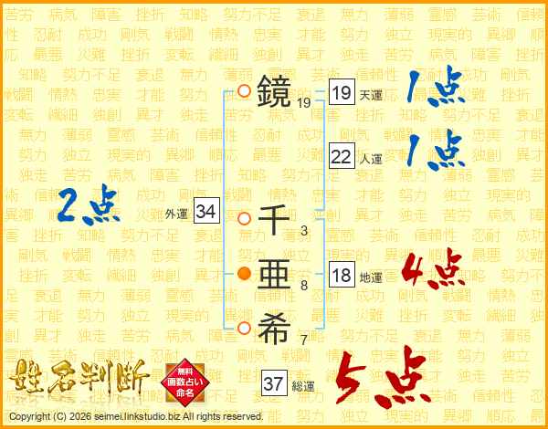 鏡千亜希さんの総運は37画の5点!