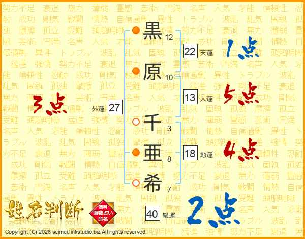 黒(12画)原(10画) 千(3画)亜(8画)希(7画)