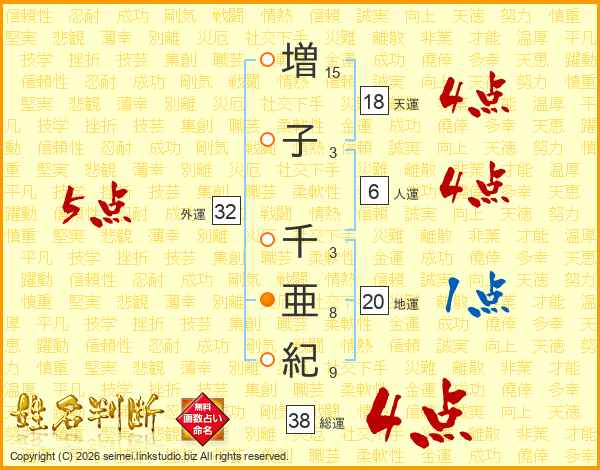 増(15画)子(3画) 千(3画)亜(8画)紀(9画)