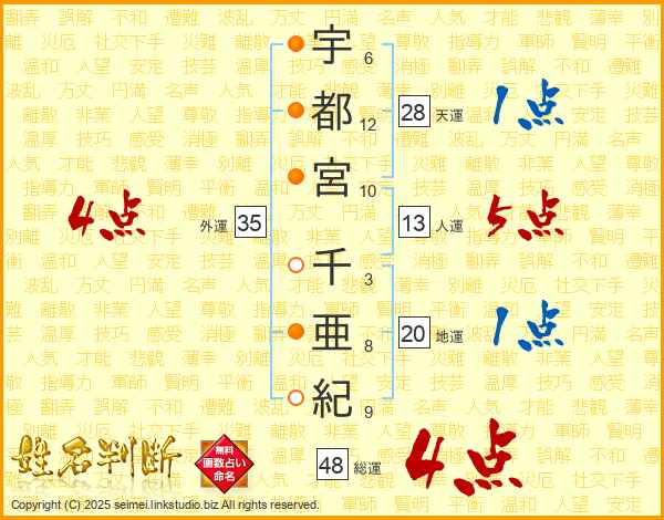 宇都宮千亜紀さんの外運は35画の4点!