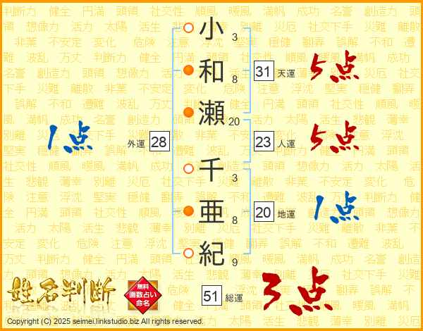 小(3画)和(8画)瀬(20画) 千(3画)亜(8画)紀(9画)
