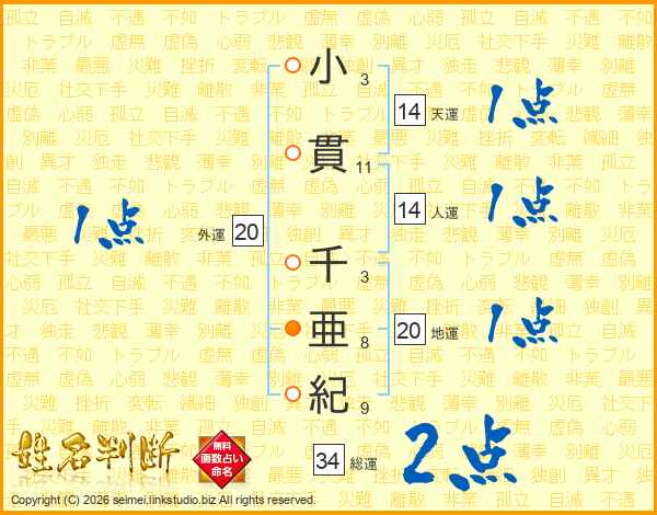 小貫千亜紀さんの総運は34画の2点!