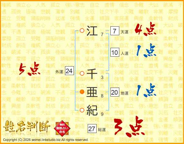 江(7画) 千(3画)亜(8画)紀(9画)