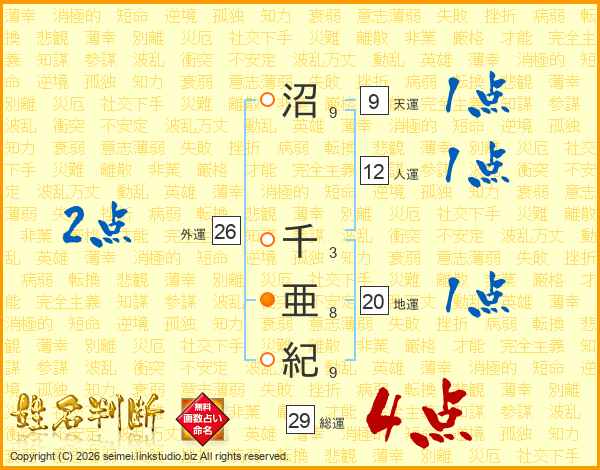沼千亜紀さんの総運は29画の4点!