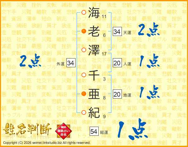 海(11画)老(6画)澤(17画) 千(3画)亜(8画)紀(9画)