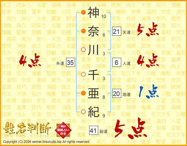 神奈川千亜紀さんの総運は41画の5点!
