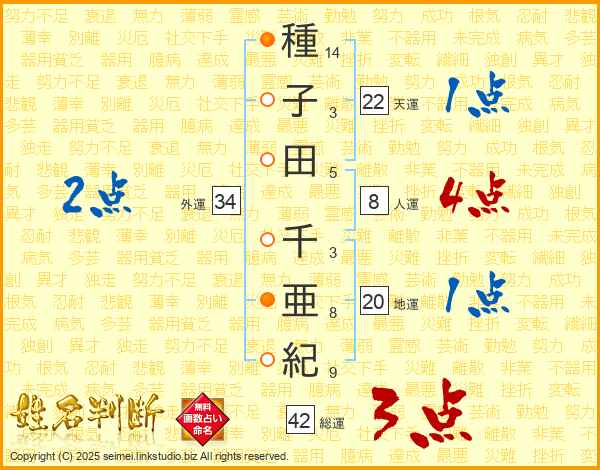 種(14画)子(3画)田(5画) 千(3画)亜(8画)紀(9画)