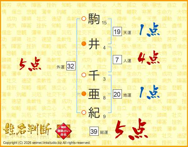 駒(15画)井(4画) 千(3画)亜(8画)紀(9画)