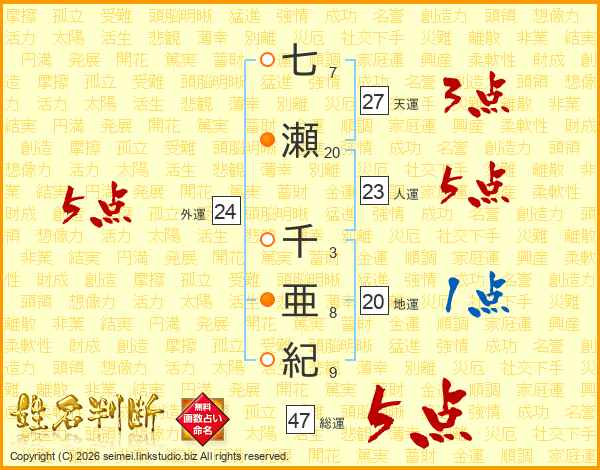 七(7画)瀬(20画) 千(3画)亜(8画)紀(9画)