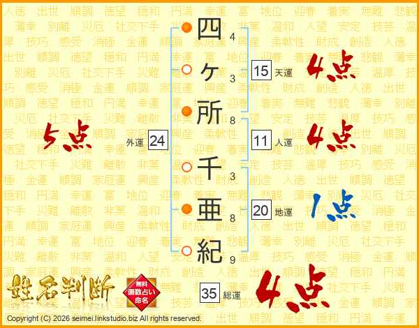 四(4画)ヶ(3画)所(8画) 千(3画)亜(8画)紀(9画)