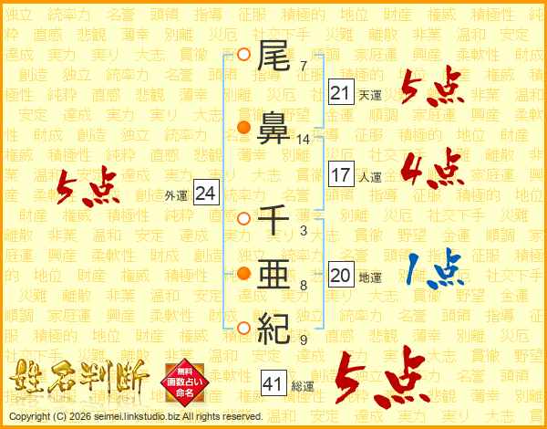 尾(7画)鼻(14画) 千(3画)亜(8画)紀(9画)