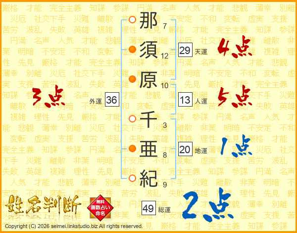 那須原千亜紀さんの総運は49画の2点!