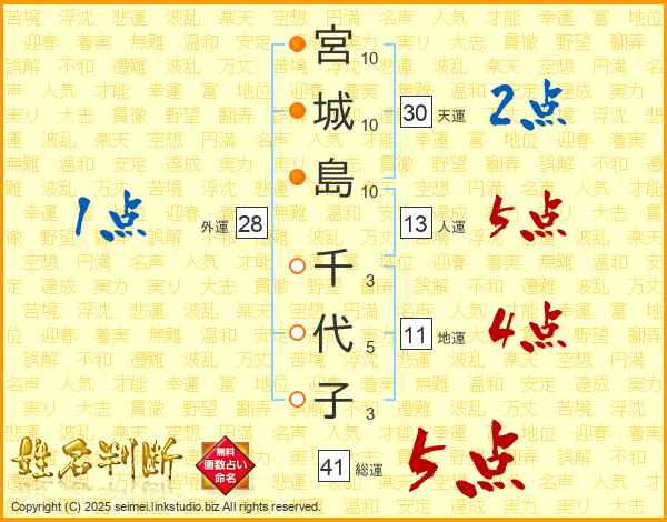 宮(10画)城(10画)島(10画) 千(3画)代(5画)子(3画)