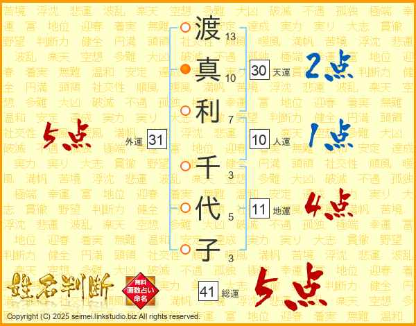 渡(13画)真(10画)利(7画) 千(3画)代(5画)子(3画)