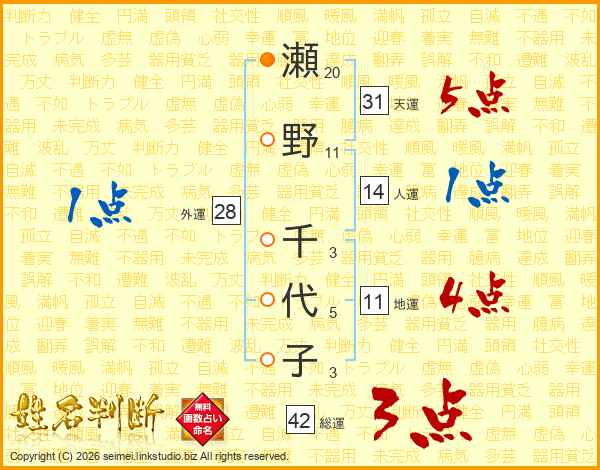 瀬(20画)野(11画) 千(3画)代(5画)子(3画)