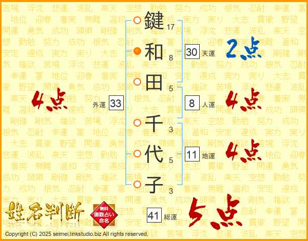 鍵(17画)和(8画)田(5画) 千(3画)代(5画)子(3画)