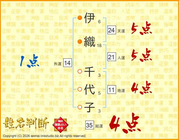 伊(6画)織(18画) 千(3画)代(5画)子(3画)