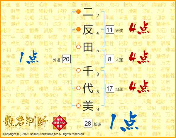 生活面を象徴する運勢です。外部から受ける影響力を表し、結婚運、家庭運や職場、環境への順応性を表します。総運から人運を引いた画数。姓や名が1文字の場合を除く。