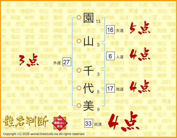 園(13画)山(3画) 千(3画)代(5画)美(9画)