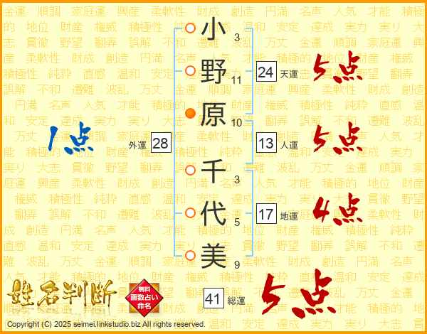 小(3画)野(11画)原(10画) 千(3画)代(5画)美(9画)