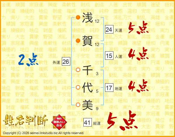 浅(12画)賀(12画) 千(3画)代(5画)美(9画)