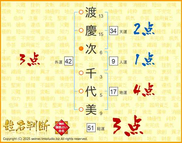 渡(13画)慶(15画)次(6画) 千(3画)代(5画)美(9画)