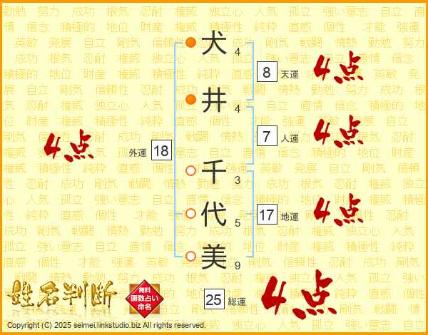 犬(4画)井(4画) 千(3画)代(5画)美(9画)