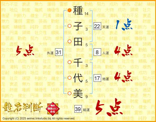 種(14画)子(3画)田(5画) 千(3画)代(5画)美(9画)
