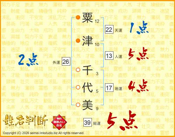 粟(12画)津(10画) 千(3画)代(5画)美(9画)
