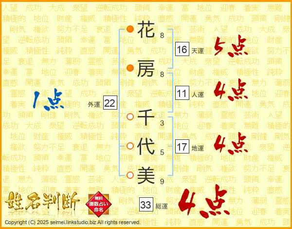 花(8画)房(8画)  千(3画)代(5画)美(9画)