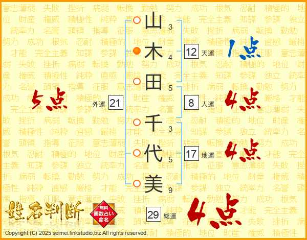 山(3画)木(4画)田(5画) 千(3画)代(5画)美(9画)