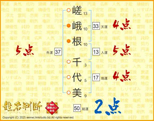 嵯(13画)峨(10画)根(10画) 千(3画)代(5画)美(9画)