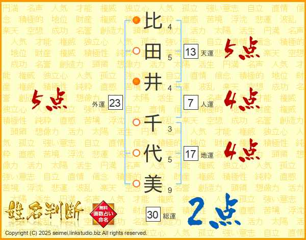 比(4画)田(5画)井(4画) 千(3画)代(5画)美(9画)