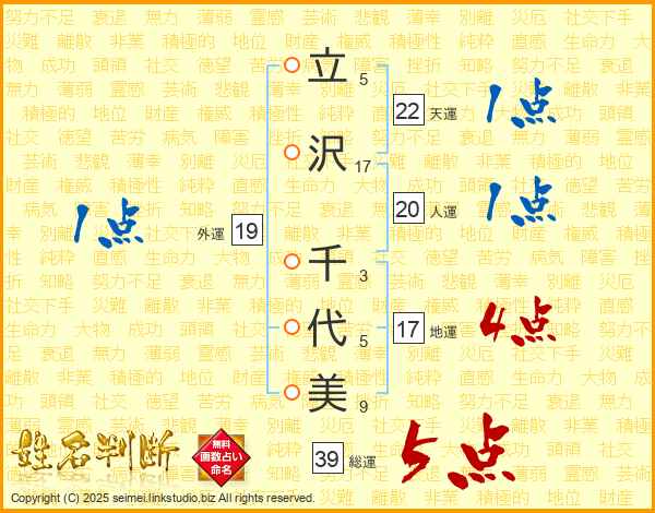 立(5画)沢(17画) 千(3画)代(5画)美(9画)
